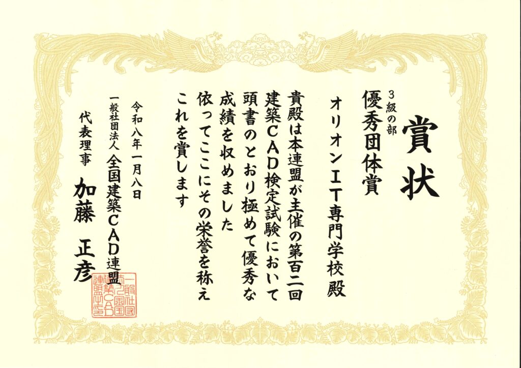 合格率が高いため、今年もオリオンIT専門学校が優秀団体として建築CAD連盟から表彰されました。