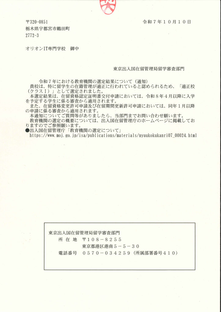 オリオンIT専門学校は今年も東京出入国在留管理局留学審査部門から適正校(クラスⅠ)に選定されました✨